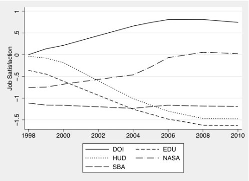 It is notable, for instance, that job satisfaction in the Department of Education fell steadily in the aftermath of the 2001 “No Child Left Behind” legislation, while NASA and the Department of the Interior saw increases in the second Bush administration.